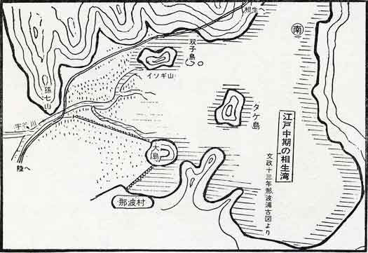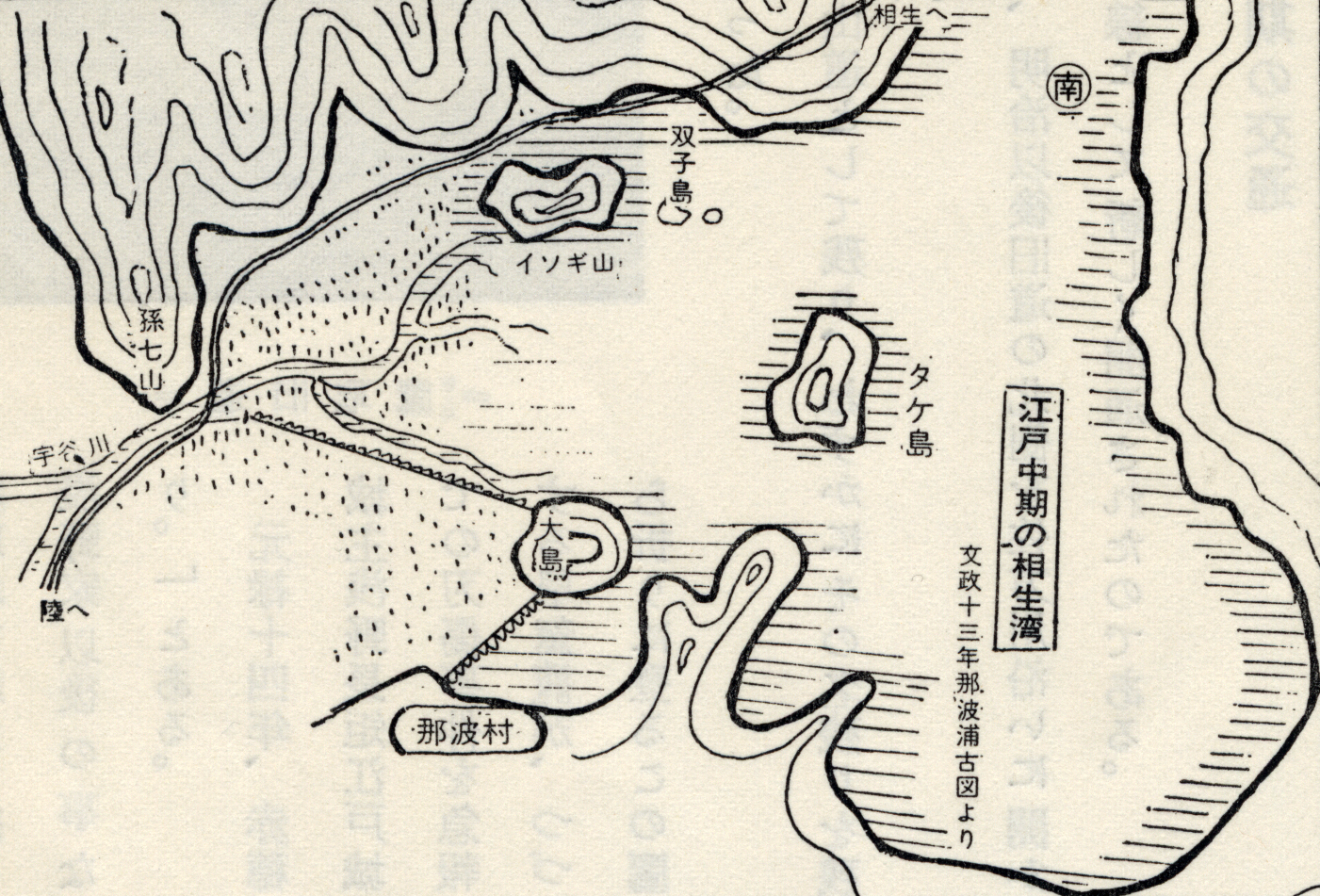 | 江戸初期の相生付近の地形や道のようすを、当時の絵図(元禄13年那波浦絵図=田中脩治氏蔵)よりみることができる。 その頃の相生は、陸付近まで湾が深く入りこみ、その湾に面して那波村・陸村・相生村・佐方村などの村落が点在し、5ケ村(池之内村を含む)合計戸数約330戸、人口2300人、牛馬90頭、石高1千4百石余りの農漁村であった。 現在市の中心部となっている旭付近は、磯際山・双子島・大島・竹島などの島々が海に浮かび、山すそが海岸線であって人家はなく、その海岸線に沿って集落を往来する道がわずかに通じているのみであった。相生から野瀬方面への道は、遠見山の東側を越す山越えの道しか通じていなかったため、往来はおもに小舟によったものと思われる。 陸から那波、佐方への道は、今も道しるべの残る陸本町付近から、苧谷川を飛び石で渡り、山際を佐方に通じていた。 鷹取峠より赤穂に通じる道は、江戸初期、赤穂藩が浅野家領地となってから以降のものである。 「播磨鑑」に、「赤穂海辺より海道昔は周世坂(赤穂高雄〜有年)を越え、百目堤をもとは姫路海道と言う。山崎・木津を経て周世坂に至る。鷹取坂を越えるは、浅野家以後の事なり。」とある。 元禄14年、赤穂城主浅野長矩江戸城での刃傷事件を急報する早駕籠が、つづら折りに登るこの鷹取坂を越え、一気に赤穂に入った。 現在この道は、荒れはてた山道として残り、わずかにその名残りを残すのみである。 その後、鷹取峠を越す道は、明治以後旧道の北側を佐方川沿いに開かれ、近年さらに国道250号線として新しく開通されたのである。 |