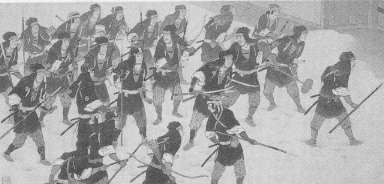 charcoal at them at random. One samurai rushed out of the room, and