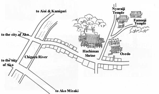 Osedo is in the east of Hachiman shrine and Yoshio Ohishi had lived in here from Akoh to Yamashina in Kyoto for two manth. Yoshio Ohishi decided surrender the Akoh castle that suppress the Kyuushin group assert a besieged. He vacated his residence April 15 in the 14th year of Genroku. He moved Yasoemon Motoya's cottage who a retainer of the Ohishis. Magozaemon Seo's elder brother,and lived here till move to Yamashina June25 this year. There was Ohishi Inari halfway a cliff a long time ago,but it was brought down under a cliff and deify now. ○Cow stone,Horse stone There is two big stone in Osedo was in a garden of the inner citadel of the Akoh castle. In the shape of lie down is called cow stone,and of stand is called horse stone. These stone is Satsuma stone. It has been handed down that was presented from a chief of Satsuma Han,Shimazu Kou of Asano Kou. (3)Nyoraiji Temple