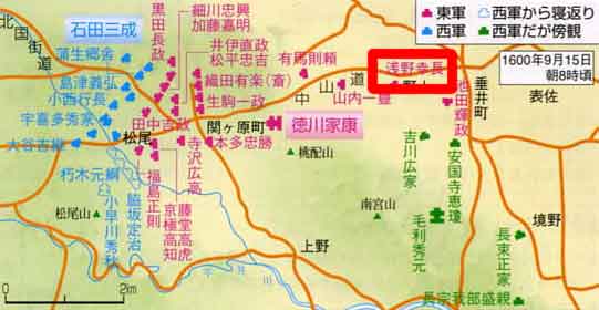 | 関ヶ原合戦の図(右上の浅野幸長さんは毛利一族の押さえ) |