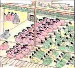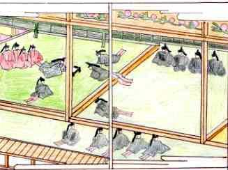 | 上段の間で将軍(左)が勅使(右)より挨拶を受ける 『徳川盛世録』より(模写は角石理和さん) |