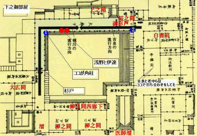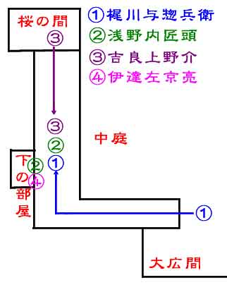 | 一人ハ大広間の御椽頬杉戸の内へ入申候、一人ハ我等後の方へ参り申候、さて大廊下御椽の方角柱の辺より見やり候へは、大広間の方御障子際に内匠・左京(伊予吉田藩主伊達村豊)両人被居夫より御白書院の御杉戸の間二三間を置候て高家衆大勢被居候体見へ候間、右の坊主に吉良を呼被呉候様申候ヘハ参候て即立帰り、吉良殿にハ只今御老中方より御用之儀有之て被参候由申聞候、 | ||||