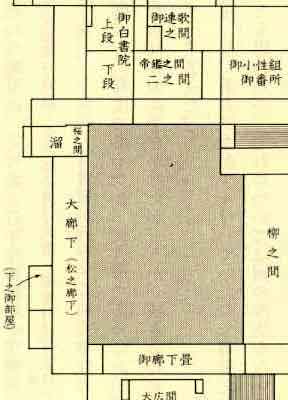 | *質問2:「御白書院の御杉戸の間二三間を置候て」は、「桜溜の杉戸から二三間(数m)手前に」と置き換えられていますが、その理由は何でしょうか。 *回答2:「御白書院の御杉戸」は上にも書いたとおり、松之大廊下始点で杉戸を開けたところの「桜溜」の向こう側に白書院がある。 梶川は図の左の青の角柱( | ||||