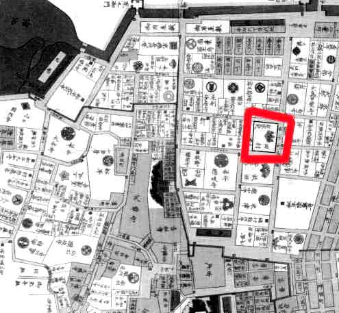 | 切腹の場所となった田村邸(□で囲った部分) | ●が浅野内匠頭さんの切腹の場所 |