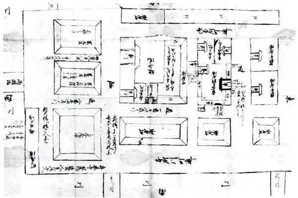 | (1)昨日御談ニ及申候、彼ノ絵図面、漸手ニいり申候間、則懸御目申候、緩々与御覧可被成候 (潮田又之丞の大石無人宛書状) (2)上野殿屋敷の絵図新古弐枚才覚致し、此図を以、内談仕候而、手組手配相定候 (『波賀朝栄聞書』) | ||||||||||||||||||||||||||||||||||||||||||||||||||