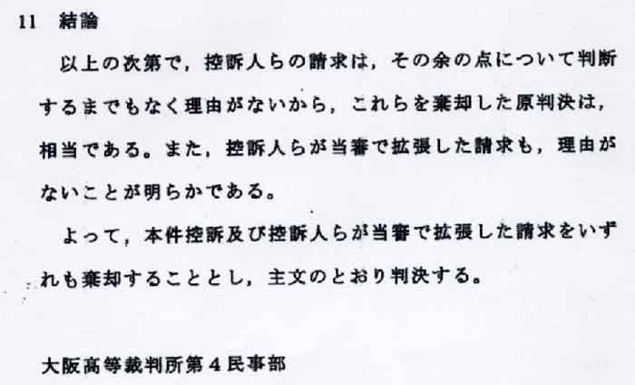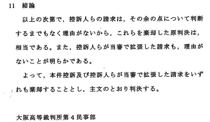 | 11 結論 以上の次第で,控訴人らの請求は,その余の点について判断 するまでもなく理由がないから,これらを棄却した原判決は, 相当である。また,控訴人らが当審で拡張した請求も,理由が ないことが明らかである。 よって,本件控訴及び控訴人らが当審で拡張した請求をいず れも棄却することとし,主文のとおり判決する。 大阪高等裁判所第4民事部 | ||||||||||