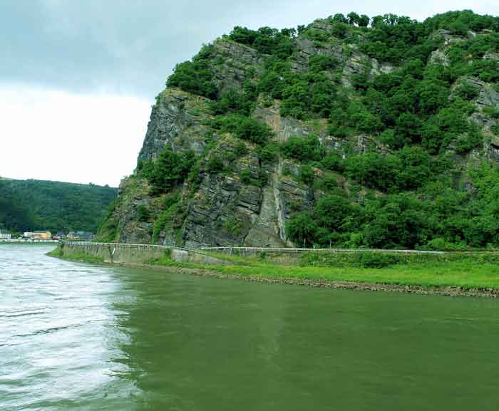 ライン川クルーズの観光船に乗り込みました。場所代としてコーヒーを注文して、観光船の舳(へさき)に座り、ライン川の前景を眺めていました。St.Goal(ザンクト・ゴアール)の近くで、下船の連絡が入り、準備をしていると、突如、右手に見上げるほどの岩山が現れました。これがローレライに因縁のある岩山でした。