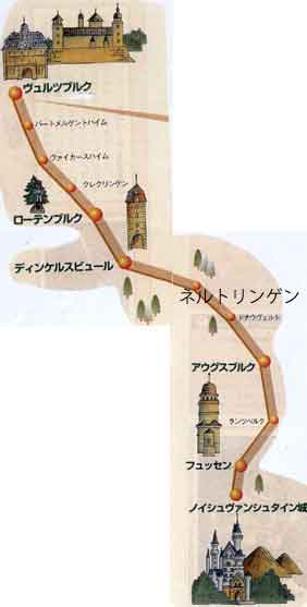 | ロマンチック街道(Romantische StraBe)は、フランクフルト東南約100qにあるヴュルツブルクからドイツ最南部にあるアルプス山麓のフュッセンまでを結ぶ約300qの街道。もとはローマへ続く通商路だったことからロマンチックの名がつきました。 |
