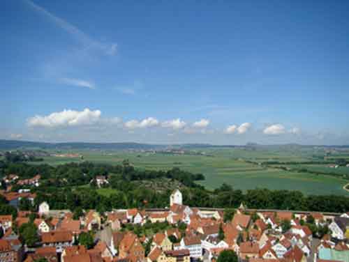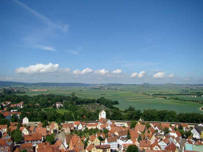 | ネルトリンゲン(Nordlingen)は、隕石が落下して出来たリース盆地にあります。聖ゲオルグ教会の90メートルの塔に登ると、中世の街並みを城壁が円形の街を囲んでいるのが分かります。 |