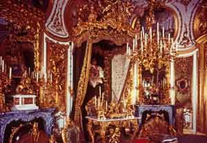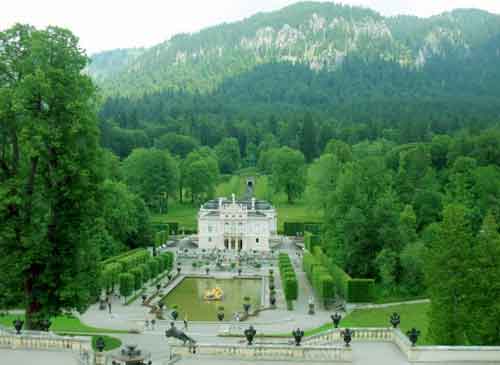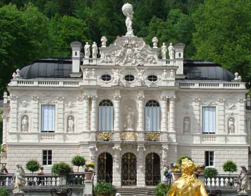 | リンダーホフ城 フランスのルイ14世のような絶対君主になることを夢みて建設した。 1878年に完成した城です。 ルートヴィヒ2世は、ノイシュヴァンシュタイン城、ヘーレンキムゼ城と、このリンダーホフ城を建設したが、ここリンダーホフ城に住むことが一番多かった。 |