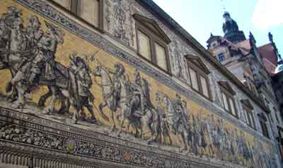 | 君主の行列 ザクセンの歴代君主の壁画。長さ100メートルで、2万5000枚のマイセンの磁器の対うが使われています。 |