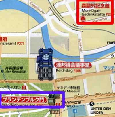 | (2)私たちは、自由時間に、ホテルから近いブランデンブルグ門を通って、森鴎外が下宿していた場所を撮影しての帰りです。歩道で前を行く人が一杯だったので、その人を追い抜こうとして、左側に出た時です。後ろから巨体の紳士から大声でわめかれました。ドイツ語なので意味は分かりませんが、「ドケー!!」という内容だったのでしょう。妻から手をひっぱられて、元の場所に戻って、左側を見ると、歩道とやや色が違った道路でした。歩道とは段差もありません。しかし、ドイツでは、歩いてはならぬ自転車だったのです。日本では、車や自転車より人間が優先されるので、びっくりしました。 ドイツ時代の森鴎外と再会できた感激に冷や水を懸けられて感じだっただけに、ドイツの自転車事情を調べるきっかけを与えてくれた小事件でした。 ドイツ在住の日本人のリポートでは、「ドイツの場合、原則的に歩道上を自転車で走ることが禁止されている」「交通量の多い大通りなどでは、歩道上に赤く塗られたり、自転車の絵が描かれたりしている自転車通行帯がある」とあります。こういう場合、特に注意が必要ということです。 | ||||||