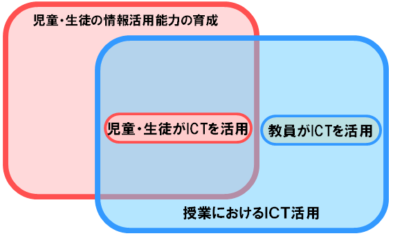 | 授業におけるICT活用とは、その授業の目標達成のためにICTを活用することをいいます。授業におけるICT活用は、児童・生徒がICTを活用して学習する場合と、教員がICTを活用して指導する場合がありますが、いずれの場合においてもICTの活用の主たる目的は、学習指導要領に示されている教科等の目標の達成です。 文部科学省では、すべての教員のICT活用指導力の向上のために、「教員のICT活用指導力の基準」(平成18年10月)において具体的なICT活用指導力の基準を示しています。 |