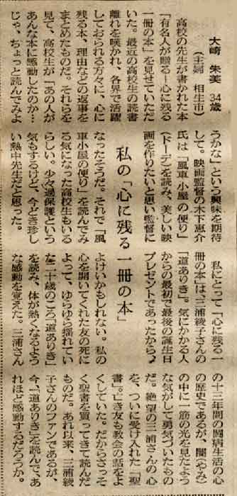 | 1983年というと、今年が2009年ですから26年前となります。私は今、66歳ですから、40歳の時の記事です。 新聞記事を探すと、朝日新聞の記事が見つかりました。下記の写真(1977年12月1日) さらに探すと、神戸新聞の記事が見つかりました。アンケートを自費出版した記事です。1978年7月7日とありました。 上記の神戸新聞の記事は、自費出版した『有名人が贈る━こころに残る一冊の本』を買っての記事なのでしょう。「いまどき珍しい熱中先生だ」には、そういう時もあったんだと、赤面の至りです。 |