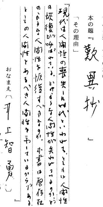| テキスト:012 *井上智男(明討)京大名誉教授 西洋史 「歎異抄」(岩波文庫) 『現代は人間性の喪失した時代といわれるとともに、人間性の恢復が叫ばれている。どのような人間性を恢復すべきなのか。本書は原存在としての人間性と、あるべき人間性を示しているからである』 |