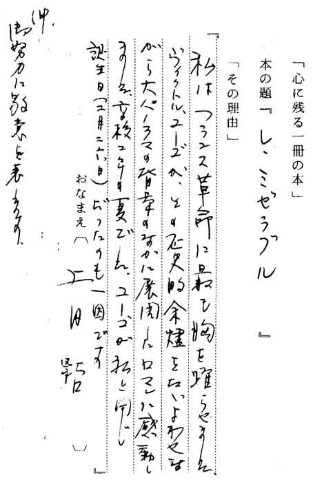 | テキスト:019 *上田 哲(昭3)国会議員 ユーゴー「レ・ミゼラブル」(岩波文庫) 『私はフランス革命に最も胸を躍らせました。ヴィクトル・ユーゴーが、その歴史的値燼をただよわせながら大パノラマの背景のなかに展開したロマンに感動しました。高校二年の夏でした。ユーゴーが私と同じ誕生日(2月26日)だったのも一因です』 |