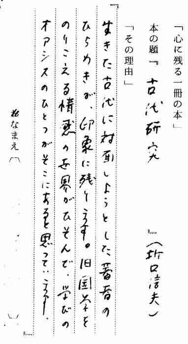 | テキスト:020 *上田正昭(昭2)京大教授 日本史 折口信夫「古代研究」(中央公論) 『生きた古代に対画しようとした著者のひらめきが印象に残ります。旧国学をのりこえる情感の世界がひそんで、学びのオアシスがそこにあると思っています』 |