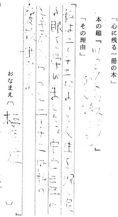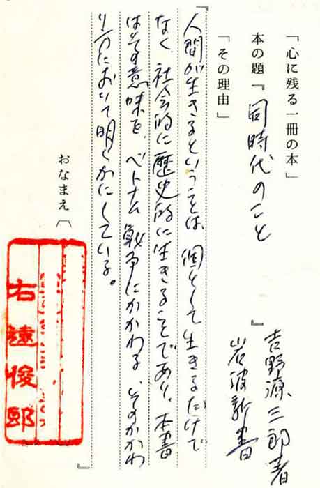 | テキスト:023 *右遠俊郎(大15)小説家 吉野源三郎「同時代のこと」(岩波新書※) 『人間が生きるということは、個として生きるだけでなく、社会的に歴史的に生きることであり・本書はその意味を、ベトナム戦争にかかわる、そのかかわり方において明らかにしている』 |