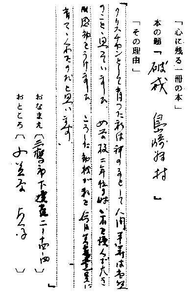 | テキスト:007*小笠原貞子(大9)国会議員 島崎藤村「破戒」(岩波文庫) 『クリスチャンとして育った私は神の子として人間平等は当然のことと思っていました。女学校二年位の時、これを読んで大きく感動をうけました』 |