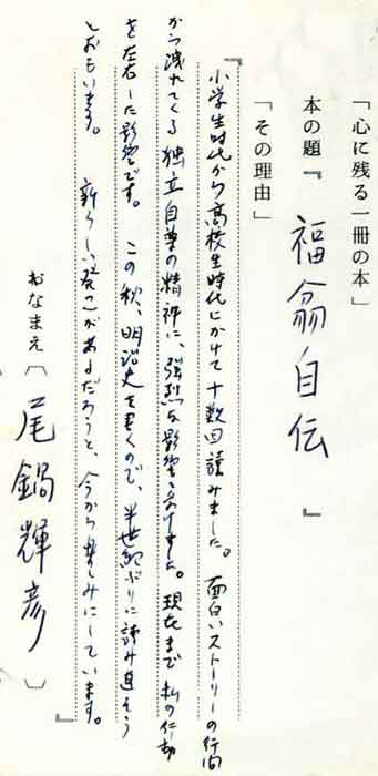 | テキスト:008*尾鍋輝彦(明41)お茶の水女子大名誉教授 西洋史 福沢諭告「福翁自伝」(岩波文庫) 『小学生時代から高校生時代にかけて十数回読みました。面白いストーリーの行間から洩れてくる独立自尊の精神に、強烈な影響を受けました。現在まで私の行動を左右した影響です。この秋、明治史を書くので、半世紀ぶりに読み直そうとおもいます。新らしい発見があるだろうと、今から楽しみにしています』 |