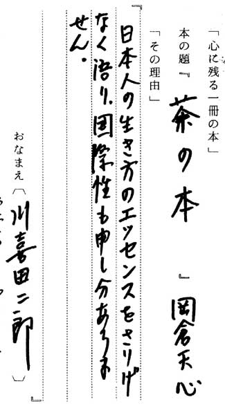 | テキスト:008*川喜田二郎(大9) 岡倉天心「茶の本」(岩波文庫)『日本人の生き方のエッセンスをさりげなく語り、国際性も申し分ありません』 |