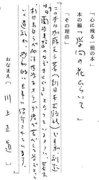 | テキスト:007*川上正道(大1)東京経済大教授 経済学 加藤支三「学問の花ひらいて」(新日本出版社慈)『副題は「『蘭学事始』のなぞをさぐる」となっているように、幕末、杉田玄自らが西洋医学をオランダ語で苦心して学びとっていく過程が、感動的に見事に紹介されています』 |