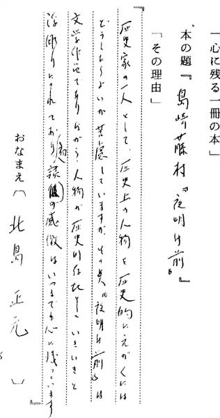 | テキスト:008北島正元(大1)立正大教授 日本近世史 島崎藤村「夜明け前」(新潮文庫)陣史家の一人として、歴史上の人物を歴史的にえがくにはどうしたらよいか苦慮していますが・その点「夜明け前」は文学作品でありながら、人物が歴史的存在としていきいきと浮彫りにされており初読の感激はいつまでも心に残っています |