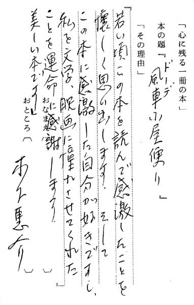 ドーデー「風車小屋便り」(岩波文庫) 『若い頃この本を読んで感激したことを懐しく思い出します。そしてこの本に感激した自分が好きですし、私を文学、映画に憧れさせてくれたことを運命に感謝します。美しい本です』 |