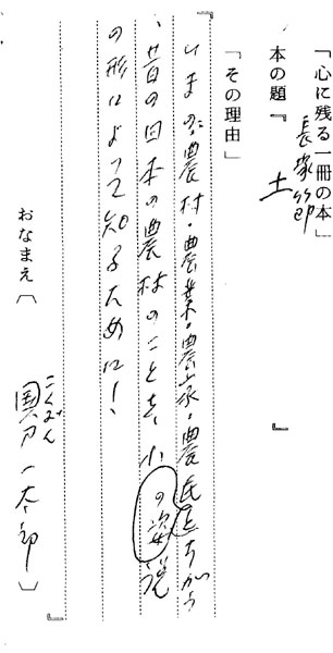 | テキスト:*国分一太郎(明朗)児童文学 長塚 節「土」(岩波文庫) 『いまの農村、農業、農家、農民の姿とちがう、昔の日本の農村のことを、小説の形によって知るた めに!』 |