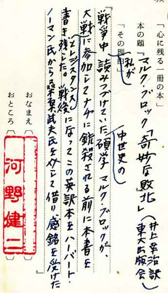 マルク・ブロック「奇妙な敗北」(東大出版会染 井上幸治訳) 『戦争中、私が読みつづけていた中世史の碩学マルク・ブロックが、大戦とレジスタンスに参加して ナチに銃殺される前に本書を書き残した。戦後になってこの英訳本をハーバート・ノーマン氏から桑 原武夫氏を介して借り、感銘を受けた』 |
