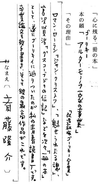ゴーリキー「アルターモーノフ一家の事業」(改造杜版ゴーリキー全集) 『ロマン・ロラン「ジャン・クリストフ」「魅せられたる魂」宮沢賢治「グスコーブドリの伝記」な どを次々「一冊の本」として、遂にゴーリキィに辿りついたのが私の青春読書歴です。卒業論文も彼 を書き、そして彼の最高作品がこれです』 |