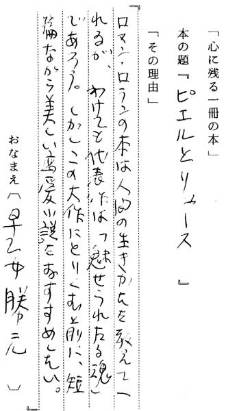 ロマン・ロラン「ピェルとリュース」(角川文庫) 『ロマン・ロランの本は人間の生きかたを教えてくれるが、わけても代表作は「魅せられたる魂」で あろう。しかしこの大作にとりくむ前に、短篇ながら美しい恋愛小説をおすすめしたい』 |