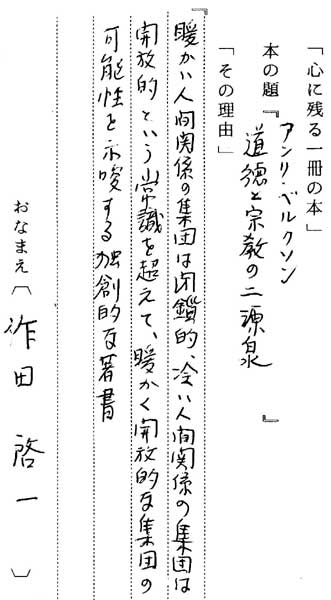 アンリ・ベルクソン「道徳と宗教の二源泉」(岩波文庫) 『暖かい人間関係の集団は閉鎖的、冷い人間関係の集団は開放的という常識を超えて暖かく開放的な 集団の可能性を示唆する独創的な著書』 |