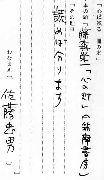 | テキスト:*佐藤忠男(昭5)映画評論家 藤森栄一「心の灯」(筑摩書房※) 『読めば分ります』 |