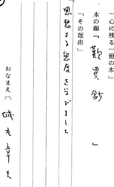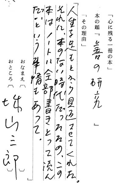 西田幾太郎「善の研究」(岩波文庫) 『人生を足もとから見返させてくれた。それに本のない時代だったため、この本はノートに全部書き とって読んだ、という事情もあって』 |