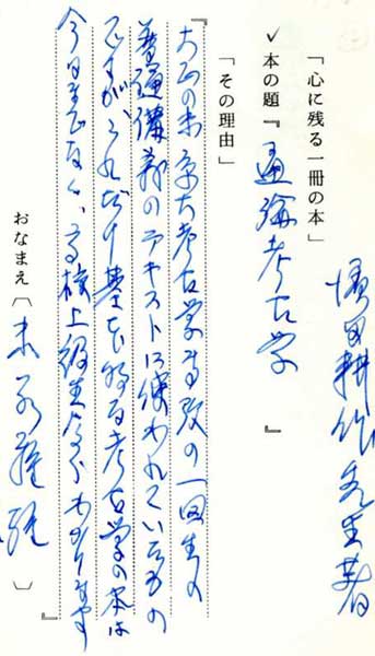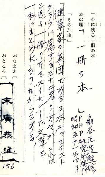 扇谷正造監修「一冊の本」(PHP研究所※) 『健筆家の集団である日本エッセイストクラブに属する32名の方々が、これはと思う一冊の本をス イセンした文章を一本にまとめたものだからである』 |