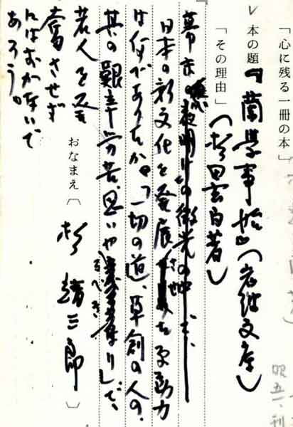 | テキスト:*杉靖三郎(明39)東京教育大名誉教授 生理学 杉田玄白「蘭学事始」J(岩波文庫) 『幕末、日本の新文化を発展させた原動力は何であったか。「一切の道、草創の人の其の艱辛労苦、 思いやるべきなり」で、若人を発奪させずにはおかないであろう。「杉田玄白」については杉靖三郎 著「夜明けの人杉田玄白」(徳間書店※)』 |