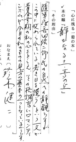 吉田紘二郎「静かなる土・麦の丘」( ) 『随筆家吉田紘二郎氏の自然への静観ですが、この中に収められている「若き日を讃う」という一文 が青春前期の私の心をとらえ、その格調高いロマンティシズムが今日の私のものの見方の基本の一つ となっているからです』 |