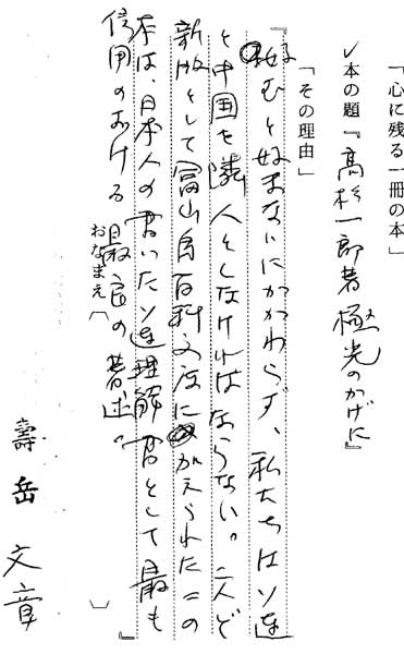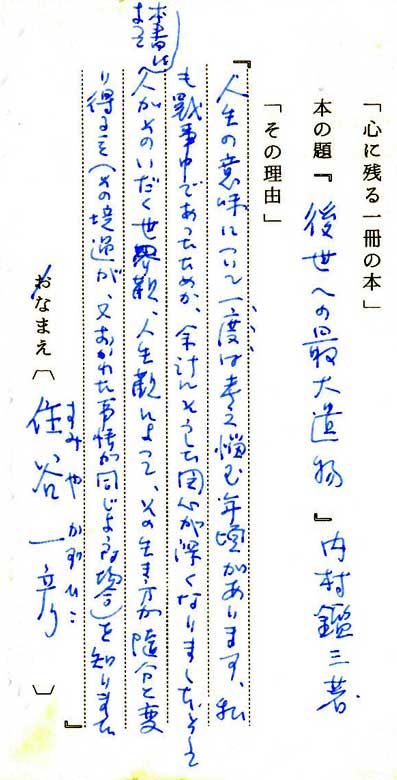 内村鑑三「後世への最大遺物」(岩波文庫) 『人生の意味について、一度は考え悩む年頃がありますが、私も戦争中であったためか余計にそうし た関心が深くなりました。そして本書によって人がそのいだく世界観、人生観によって、その生き方 が随分と変わり得ること(その境遇が、叉おかれた事情が同じような場合)を知りました』 |