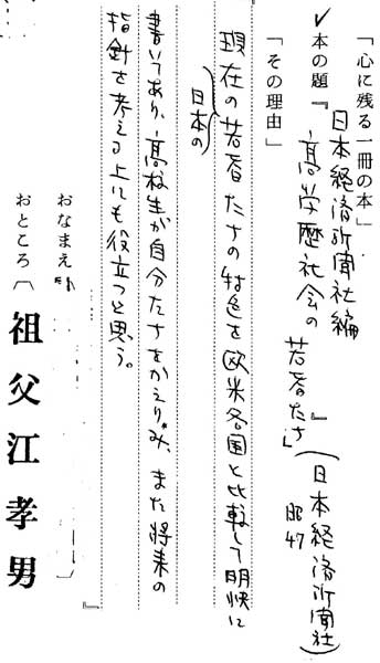日本経済新聞社編「高学歴社会の若者たち」(日経※) 『現在の日本の若者たちの特色を欧米各国と比較して明快に書いてあり、高校生が自分たちをかえり み、また将来の指針を考える上にも役立つと思う』 |