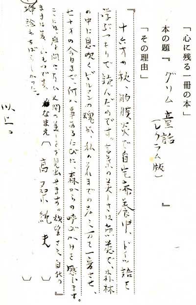 「グリム童話」(レクラム版)(岩波文庫) 『十六才の秋、胸膜炎で自宅療養中、ドイツ語を学ぶつもりで読んだのです。言葉の美しさは無類で 森林の中に息吹くゲルマンの魂が、私のそれまでの考え方を一変させ、七十才の今日まで、何か事あ るたびに、森からの呼びかけを感じます。ここには、学問にない人間の美しさを見出せます。欲望さ え自我のままは美しいものです』 |