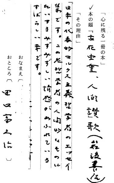 | テキスト:002 *田口宮久治(昭6) 名大教授 政治学 古在由重「人間讃歌」(岩波書店※) 『日本の代表的マルクス主義哲学者のエッセイ集です。この老哲学者の人間的なものにたいするみず みずしい情感があふれているすばらしい本です』 |