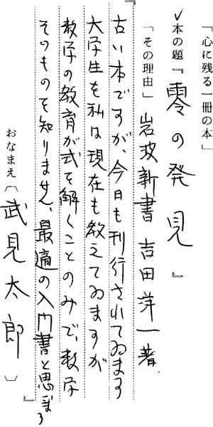 吉田洋一「零の発見」(岩波新書※) 『古い本ですが、今日も刊行されています。大学生を私は現在も教えていますが、数学の教育が式を 解くことのみで、数学そのものを知りません。最適の入門書と思います』 |