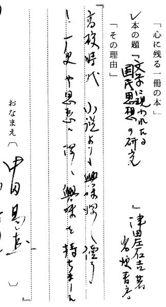 | テキスト:001 **中田易直(大8)中大教授 日本史 津田左右吉「文学に現われたる国民思想の研究」(岩波書店※) 『高校時代、小説よりも興味深く読了し、歴史や思想に深く興味を持ちました』 |