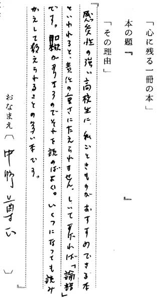 | テキスト:002 **中野尊正(大9)都立大教授 地理学 「論語」(岩波文庫) 『感受性の強い高校生に、私ごときものがおすすめできる本といわれると、責任の重さにたえられません。しいてあげるならば「論語」です。口訳がありますのでそれを読めばよい。いくつになっても読みかえして教えられることの多い本です』 |