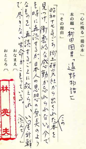 | テキスト:001 *林 英夫(大8)立大教授 日本史 柳田国男「遠野物語」(角川文庫) 『昭和17年ごろ郷土研究社から出されたこの本を見つけ、衝撃的な感動が忘れられない。今でも時に再読するが、日本人の思想の原点のようなものを、再読するごとに教えられ、いつ読んでも新鮮で尽きない生命がこもっている』 |