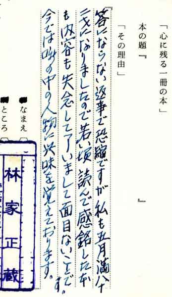 | テキスト:002 **林家正蔵(明28)落語家 『答にならない返事で恐縮ですが私も五月満82才になりましたので、若い頃読んで感銘した本も内容も失念して了いまして面目ないことです。今では噺の中の人物に興味を覚えております』 |