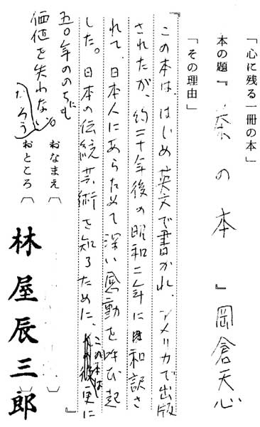 | テキスト:001 **林屋辰三郎(大3)京大教授 日本史 岡倉天心「茶の本」(岩波文庫) 『この本は、はじめ英文で書かれ、アメトカで出版されたが、約20年後の昭和2年に和訳されて、日本人にあらためて深い感動を呼び起した。日本の伝統芸術を知るために、この本は更に50年ののちにも価値を失わないだろう』 |