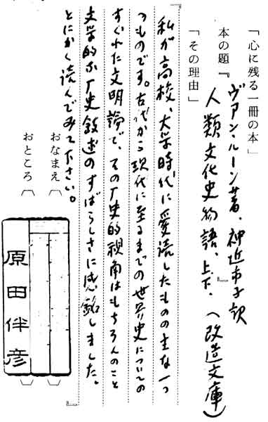 | テキスト:002 **原田伴彦(大6)大阪市立大教授 日本史 ヴァン・ルーン著、神近市子訳「人類文化史物語上・下」(改造文庫藁)『私が高校、大学時代に愛読したものの主な一つのものです。古代から現代に至るまでの世界史についてのすぐれた文明論で、その歴史的視角はもちろんのこと文学的な歴史叙述のすばらしさに感銘しました。とにかく読んでみて下さい』 |