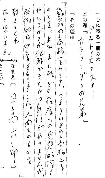 | テキスト:001 **日高六郎(大6)元東大教授 社会学 ドストエフスキー「カラマーゾフの兄弟」(岩波文庫) 『戦前の高校1年のとき、つまりいまの高校3年のとき、よみました。どの程度その思想的深さやひろがりが理解できたかは自信がありませんが、圧倒的な印象をもちました。人間そのものを教えてくれたと思います』 |